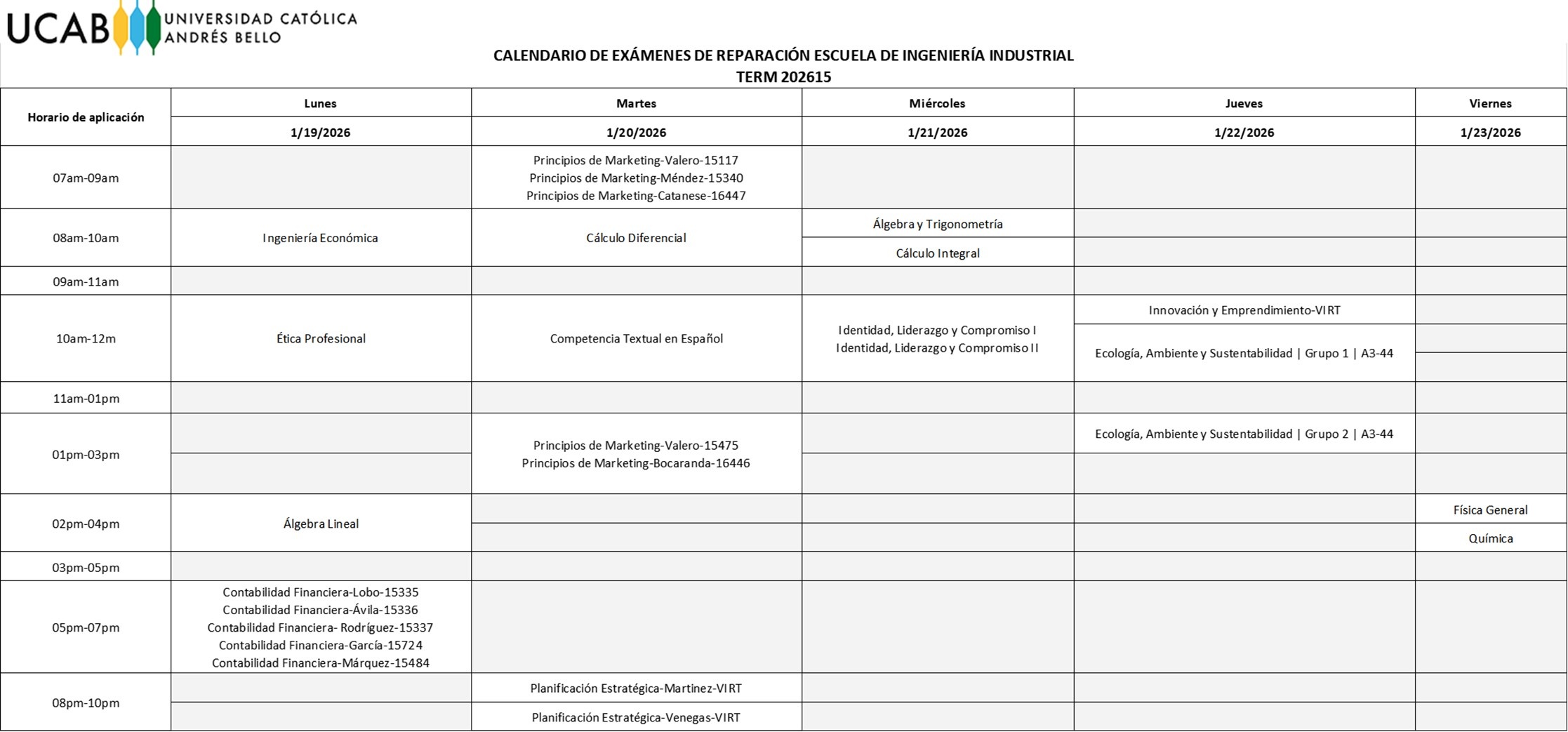 En su última sesión, el Consejo de Facultad de Ingeniería aprobó el siguiente calendario para los exámenes de reparación del periodo 202615, en el que se indican los profesores integrantes del jurado correspondiente.
